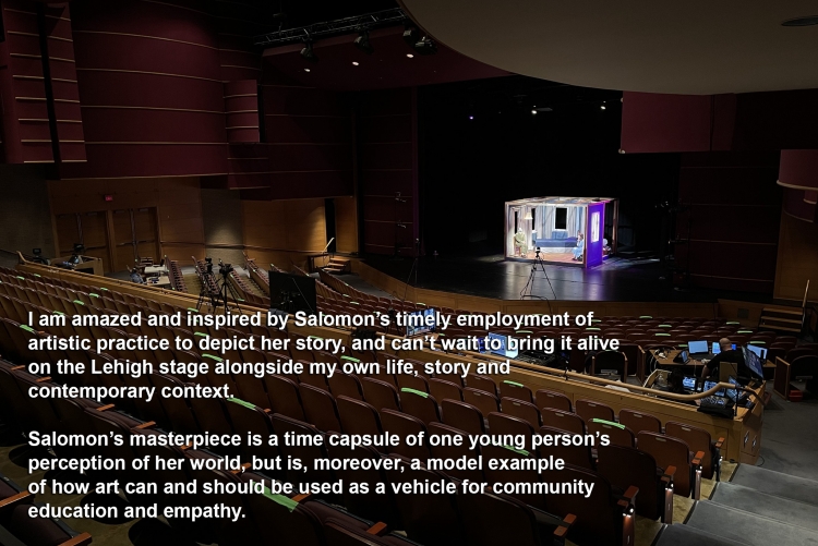 "I believe that theatre artists are uniquely well equipped to meet the challenges of communicating and storytelling, because we understand the importance of connecting with people quickly and creatively, and doing so in a way that is appealing and impactful to an audience. By writing and producing this play, I will demonstrate the power of education packaged within entertainment; I believe that theatre, in a time like the current pandemic, is a way to provoke awareness (and ultimately the most inclusive conversation possible) about important social issues within our communities. I hope this project will deepen my knowledge and facility with dramatic literature and art, while I learn to hone and convey messages for my contemporary audience in a way that builds my community. Additionally, I’ll get to develop my theatre and arts management skills through exposure to new areas of production and partnerships with other experts . . . I am amazed and inspired by Salomon’s timely employment of artistic practice to depict her story, and can’t wait to bring it alive on the Lehigh stage alongside my own life, story and contemporary context. Salomon’s masterpiece is a time capsule of one young person’s perception of her world, but is, moreover, a model example of how art can and should be used as a vehicle for community education and empathy."