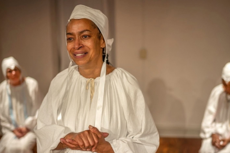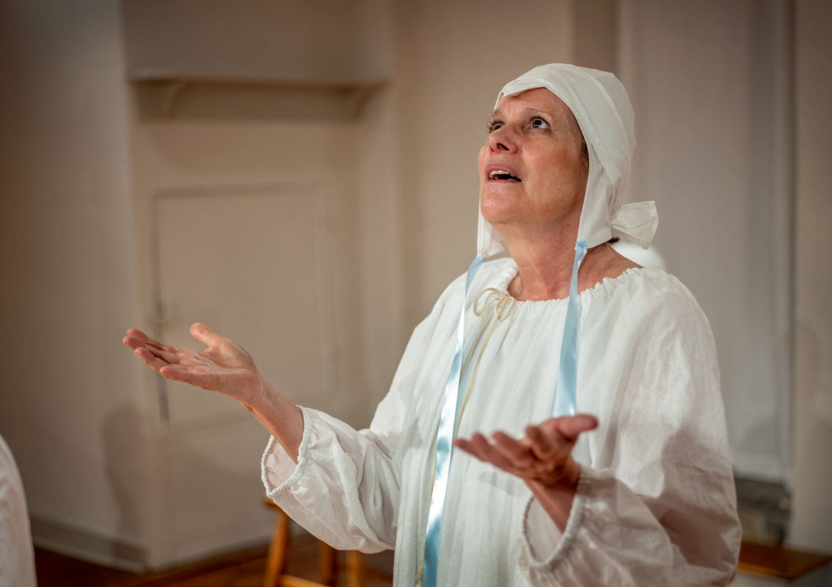 In Hidden Seed: Bethlehem's Forgotten Utopia, based on Lehigh English Professor Seth Moglen’s historical manuscript, Moglen was writing a theatrical script for the very first time. I worked closely with him to help him navigate the process through readings and workshops. The story of Bethlehem’s roots is told by three women. A enslaved African, a Native American, and a German immigrant, now ghosts, have returned to lay bare the glorious and ugly moments of the Moravians’ founding of the city. For this production, I designed both the environment and historically accurate costumes. I was fortunate to have the museum and curators literally next door for my research. Since the performance took place in the Single Sister House, a preserved Moravian building, the space itself was the perfect environment supplemented by simple props. As the audience entered up the staircase, they encountered each woman in a separate room, one at the spinning wheel, one knitting, and a third writing a letter. As the performance began, the three women gathered together in the playing space, surrounded by a ring of chairs in the large common room.