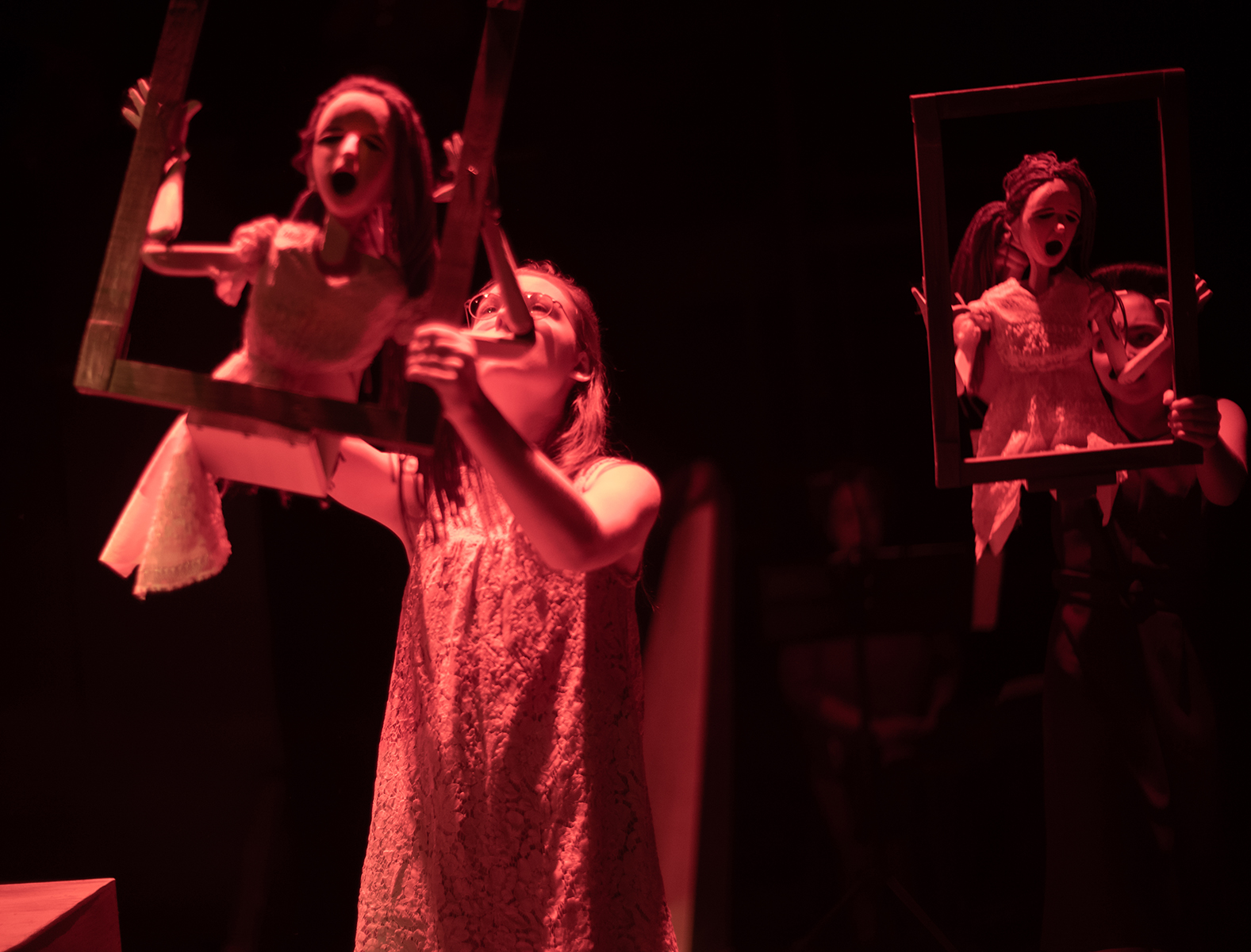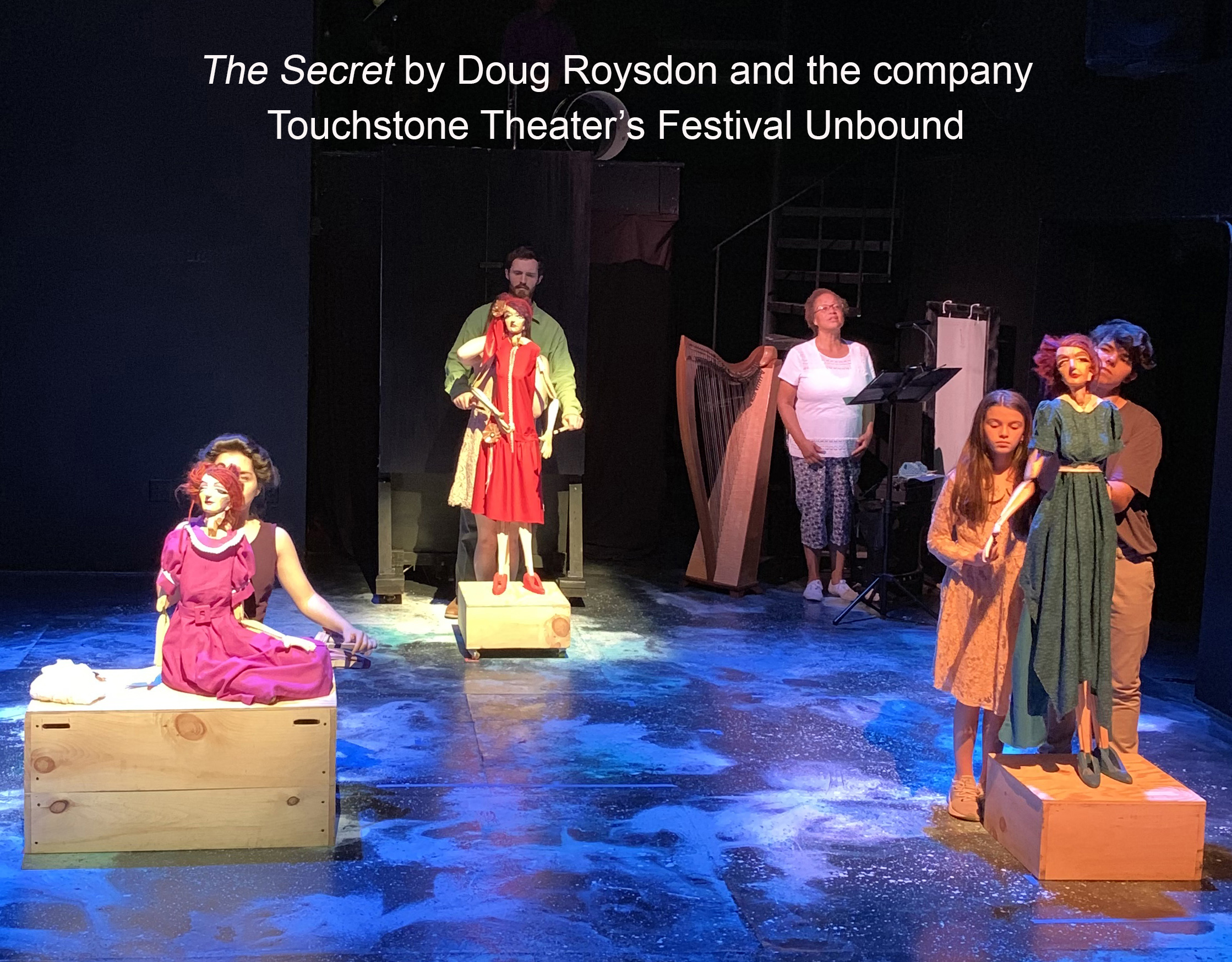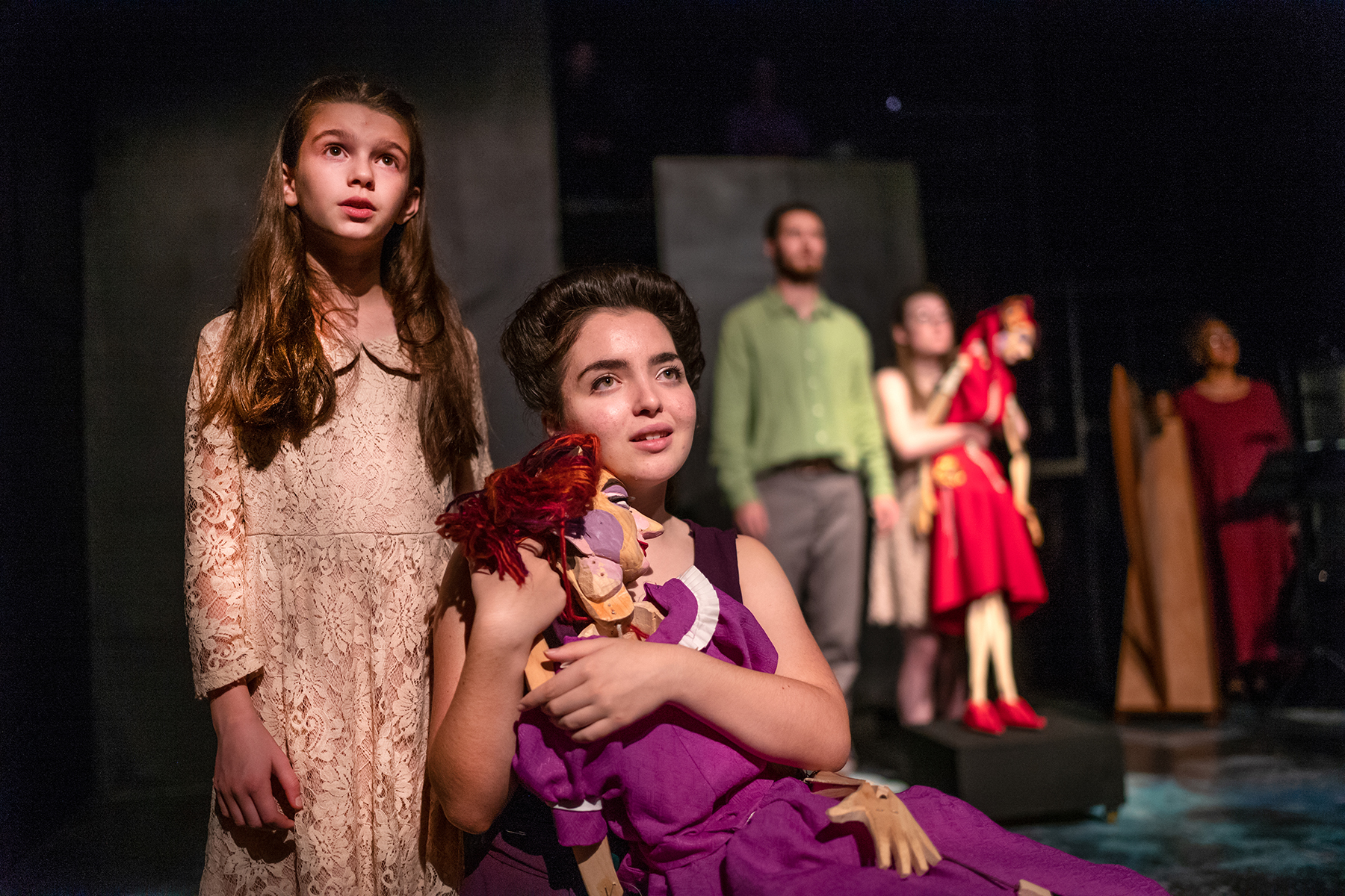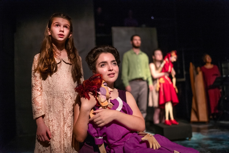 The Secret won the 2019 Play of the Year at the ABE Awards in the Lehigh Valley Press. Coproduced by Mock Turtle Marionette Theatre, it was a visceral and musical journey through queer poet and Bethlehem native, Hilda Doolittle’s, life and poetry. The play, completely devised by the company, combined Hilda’s poetry and life events to create a visually and aurally compelling performance. This was the first time I was creating an environment for performers, musicians, and host of puppets. Meeting all the needs was a special challenge in a small venue and limited timeline. This was a true community effort as my students built the numerous hand-made paper flowers and details used throughout the play.The Secret is about the life of and work of poet Hilda Doolittle (H.D.). The play, coproduced by Mock Turtle Marionette Theater and Touchstone, is the culmination of Finding. H.D., a 12-month public community-based exploration of Doolittle, who is now widely recognized as a queer, feminist visionary, and the most influential literary figure born in the Lehigh Valley.