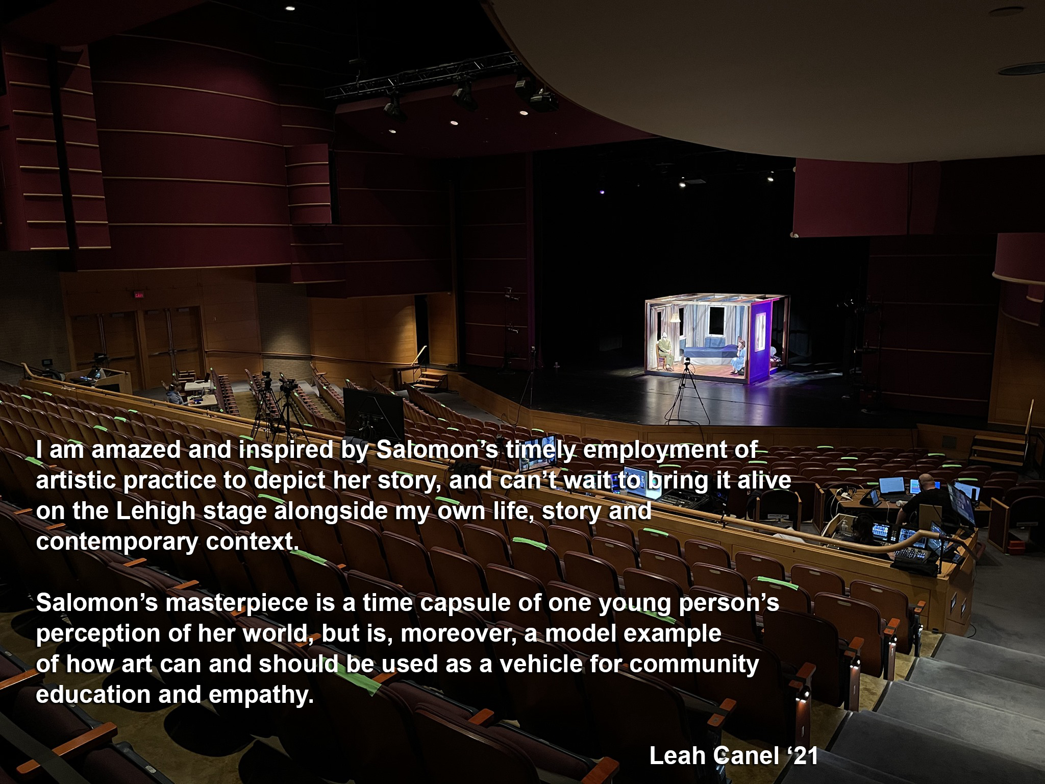 "I believe that theatre artists are uniquely well equipped to meet the challenges of communicating and storytelling, because we understand the importance of connecting with people quickly and creatively, and doing so in a way that is appealing and impactful to an audience. By writing and producing this play, I will demonstrate the power of education packaged within entertainment; I believe that theatre, in a time like the current pandemic, is a way to provoke awareness (and ultimately the most inclusive conversation possible) about important social issues within our communities. I hope this project will deepen my knowledge and facility with dramatic literature and art, while I learn to hone and convey messages for my contemporary audience in a way that builds my community. Additionally, I’ll get to develop my theatre and arts management skills through exposure to new areas of production and partnerships with other experts . . . I am amazed and inspired by Salomon’s timely employment of artistic practice to depict her story, and can’t wait to bring it alive on the Lehigh stage alongside my own life, story and contemporary context. Salomon’s masterpiece is a time capsule of one young person’s perception of her world, but is, moreover, a model example of how art can and should be used as a vehicle for community education and empathy."