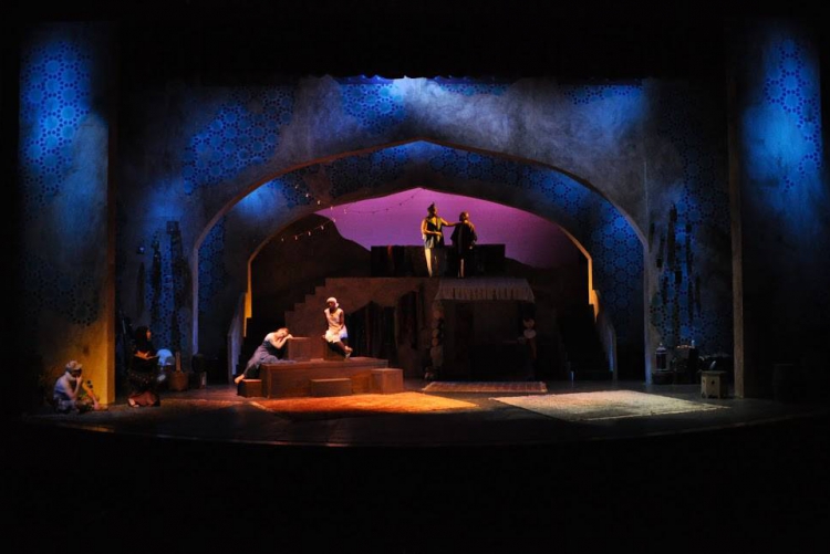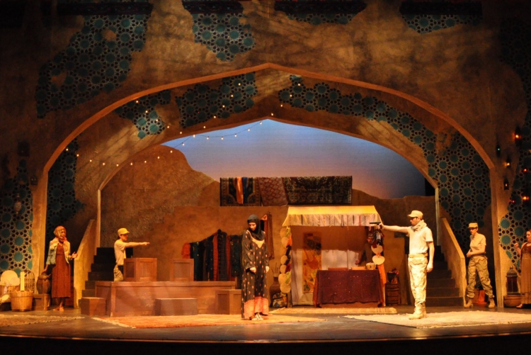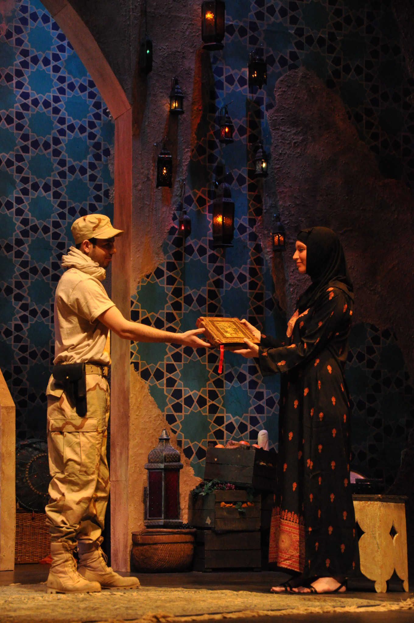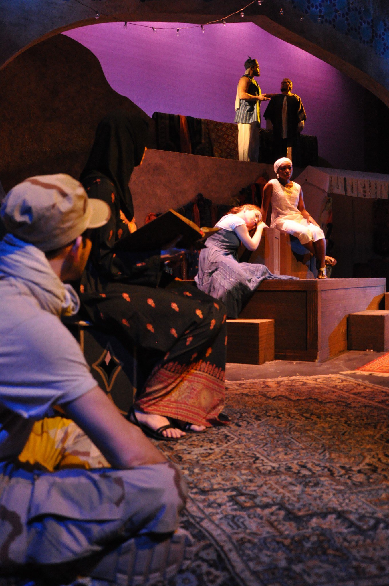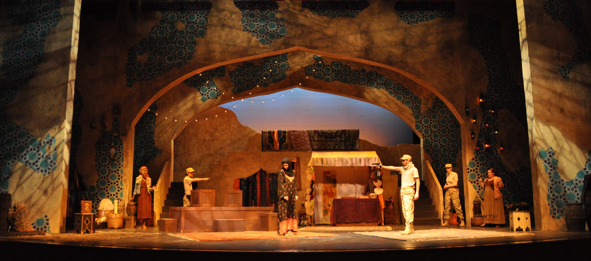 At Lafayette College, our production of The Arabian Nights was an ancient story with a modern approach. This was an opportunity to reimagine a famous collection of stories in the context of modern Iraq with an Iraqi woman recounting the stories to an American soldier. Through this lens, the stories gained a different political and cultural perspective. Set in a modern Iraqi bazaar where old and new worlds collide, the passageways in an old converted mosque and the barrage of sights and sounds of a modern outdoor market created a rich visual landscape. The fantastical stories were created using objects and wares from the various booths and sellers in the market setting.