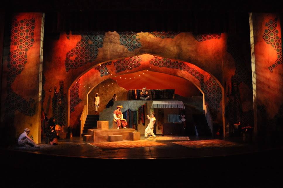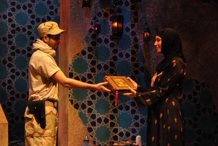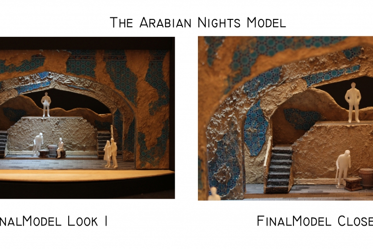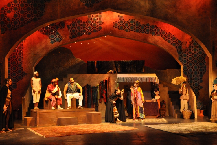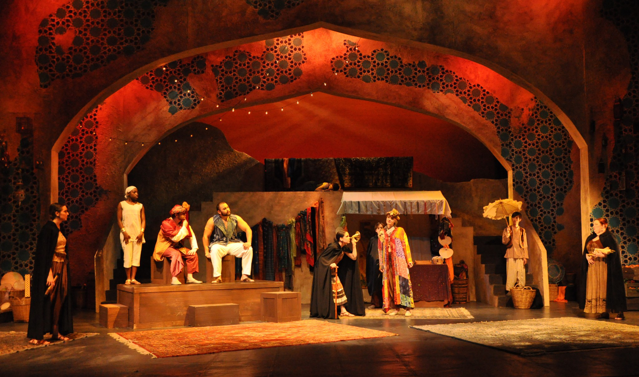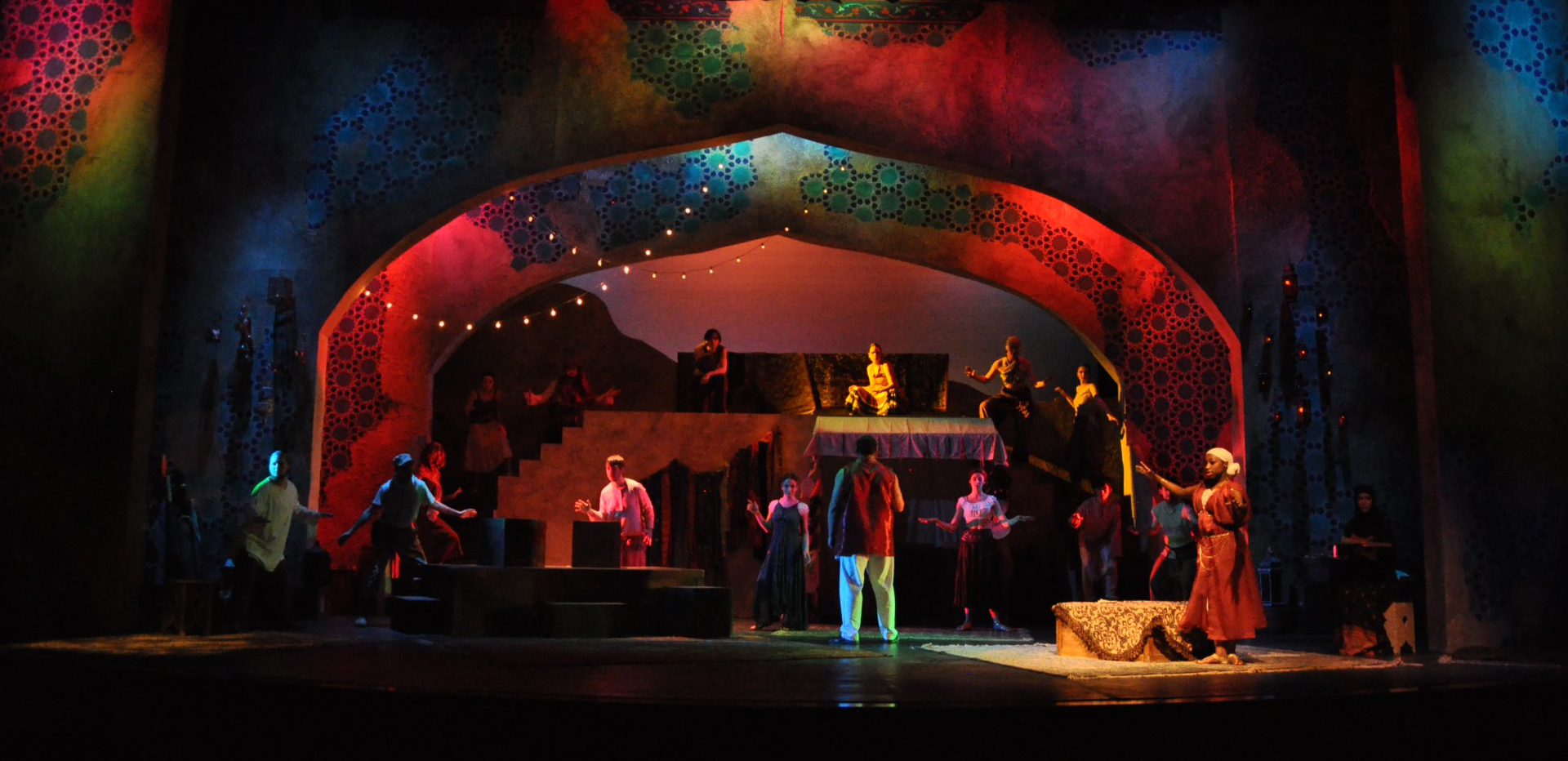 At Lafayette College, our production of The Arabian Nights was an ancient story with a modern approach. This was an opportunity to reimagine a famous collection of stories in the context of modern Iraq with an Iraqi woman recounting the stories to an American soldier. Through this lens, the stories gained a different political and cultural perspective. Set in a modern Iraqi bazaar where old and new worlds collide, the passageways in an old converted mosque and the barrage of sights and sounds of a modern outdoor market created a rich visual landscape. The fantastical stories were created using objects and wares from the various booths and sellers in the market setting.