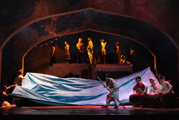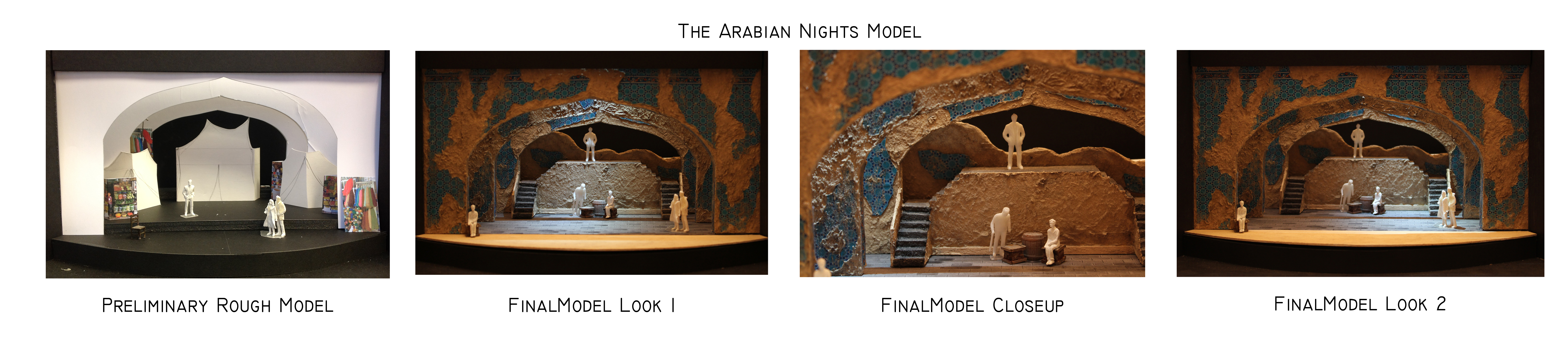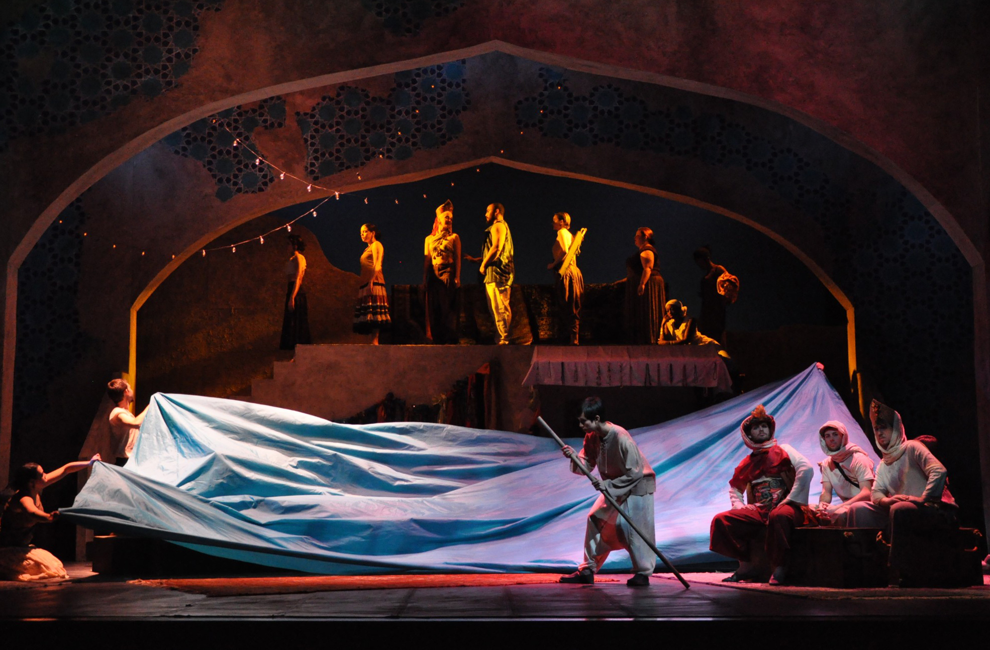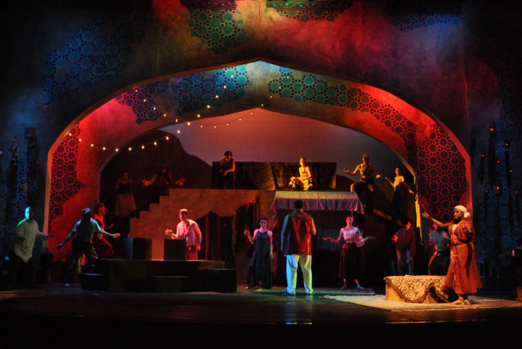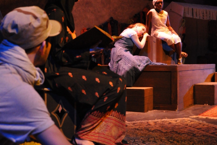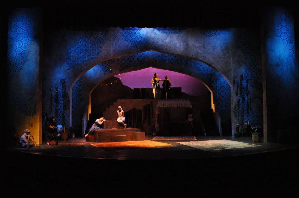 At Lafayette College, our production of The Arabian Nights was an ancient story with a modern approach. This was an opportunity to reimagine a famous collection of stories in the context of modern Iraq with an Iraqi woman recounting the stories to an American soldier. Through this lens, the stories gained a different political and cultural perspective. Set in a modern Iraqi bazaar where old and new worlds collide, the passageways in an old converted mosque and the barrage of sights and sounds of a modern outdoor market created a rich visual landscape. The fantastical stories were created using objects and wares from the various booths and sellers in the market setting.