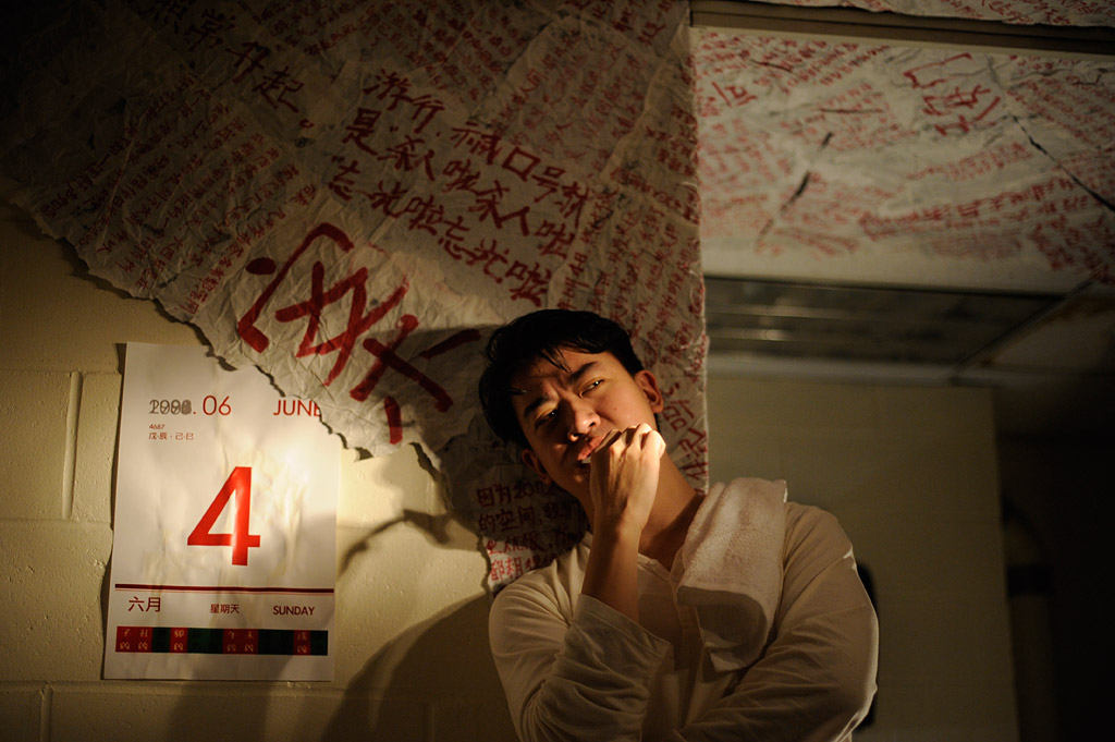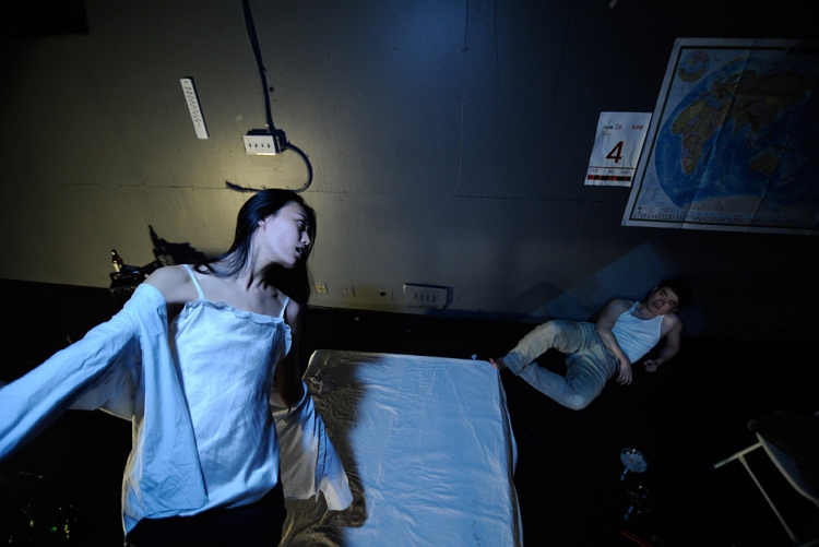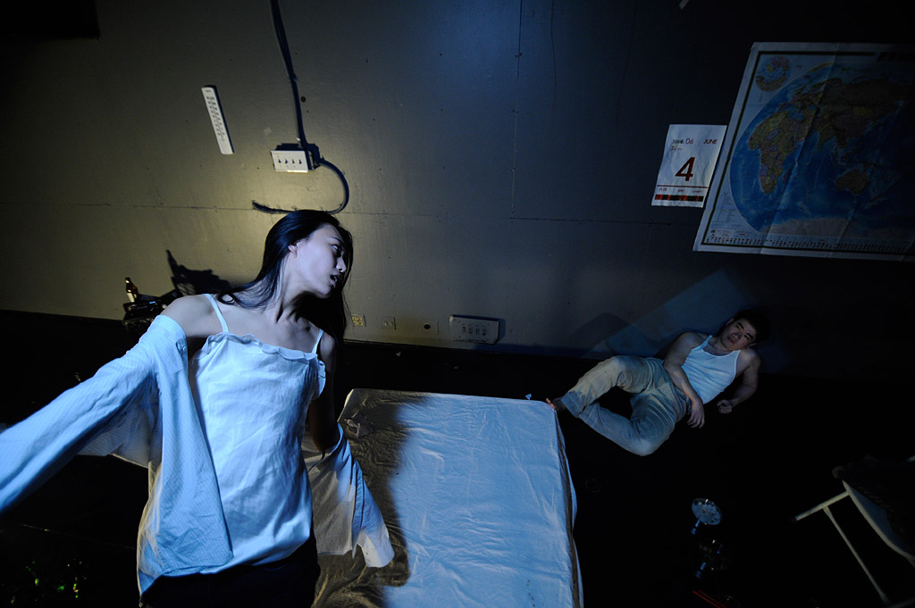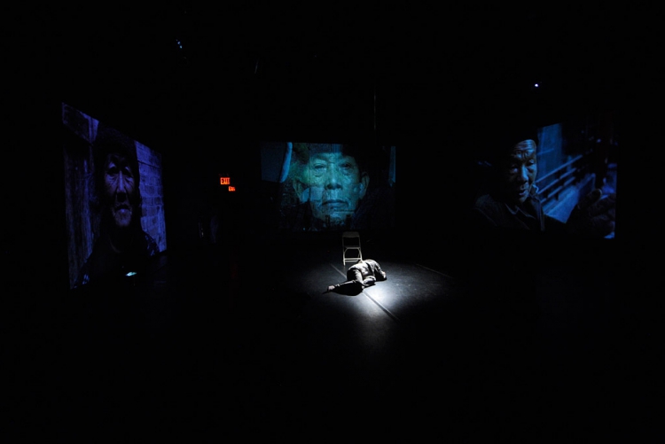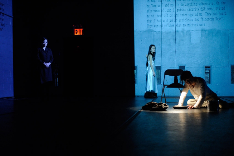19, a design-based devised piece was based on Chinese dissident Liao Yiwu’s essay, 19 days, an account of memory over a 19 year period on each yearly anniversary of the Tiananmen Square massacre. Starting our process with only designers and the director in the room, we responded to the text using a technique based on an exercise that I use in my design classes, “poetic sensual imaging.” This exercise used impulses and physical senses to ask, “What do you see? What do you hear?” Through this technique, we began to create poetic images that expressed the text. Initially, we created a visual and aural landscape for the audience’s journey and eventually added two actors to the process who became several characters. I created an immersive installation where the audience followed the action through several rooms.