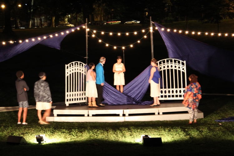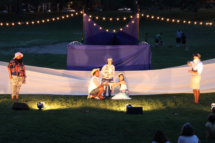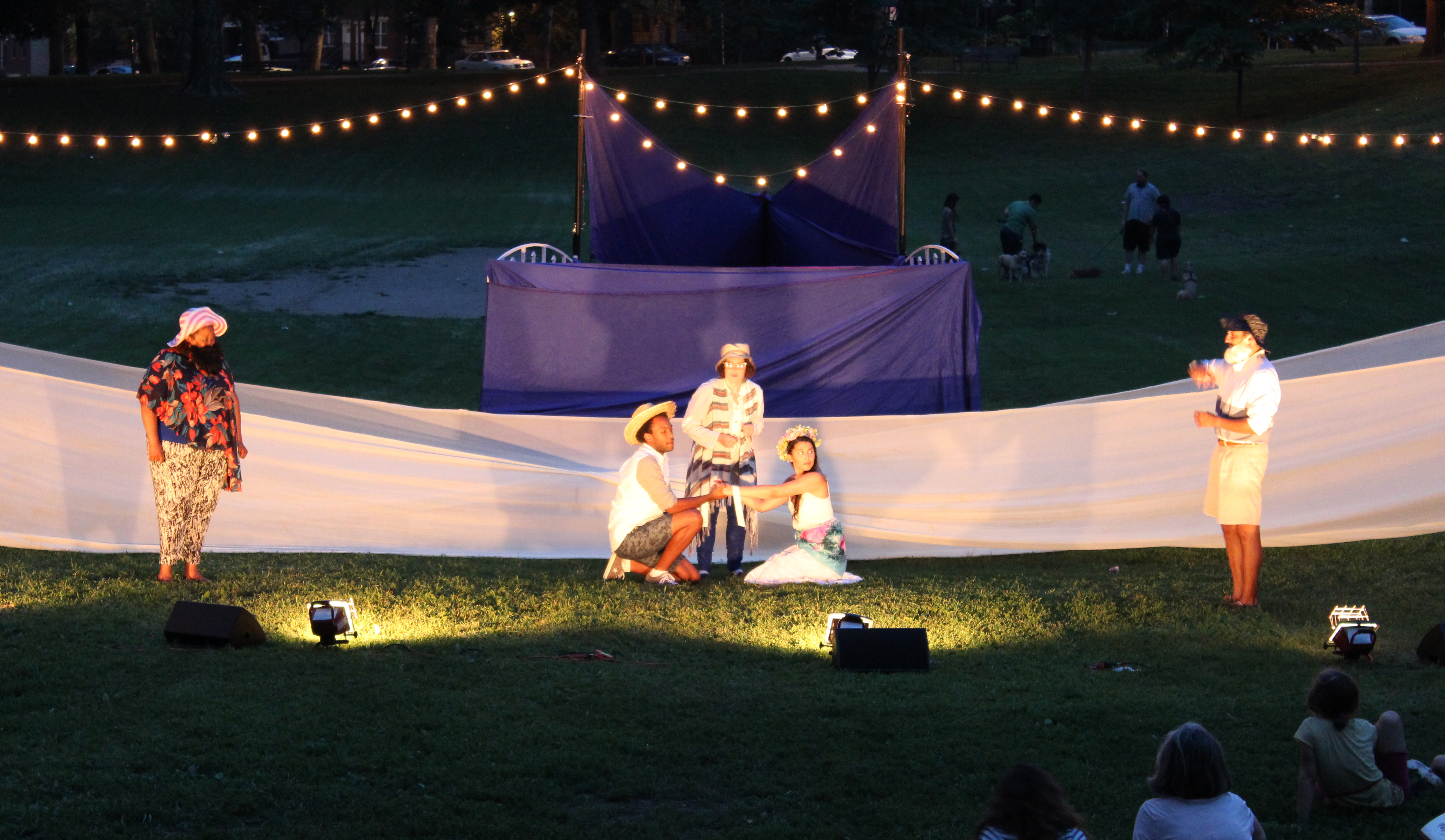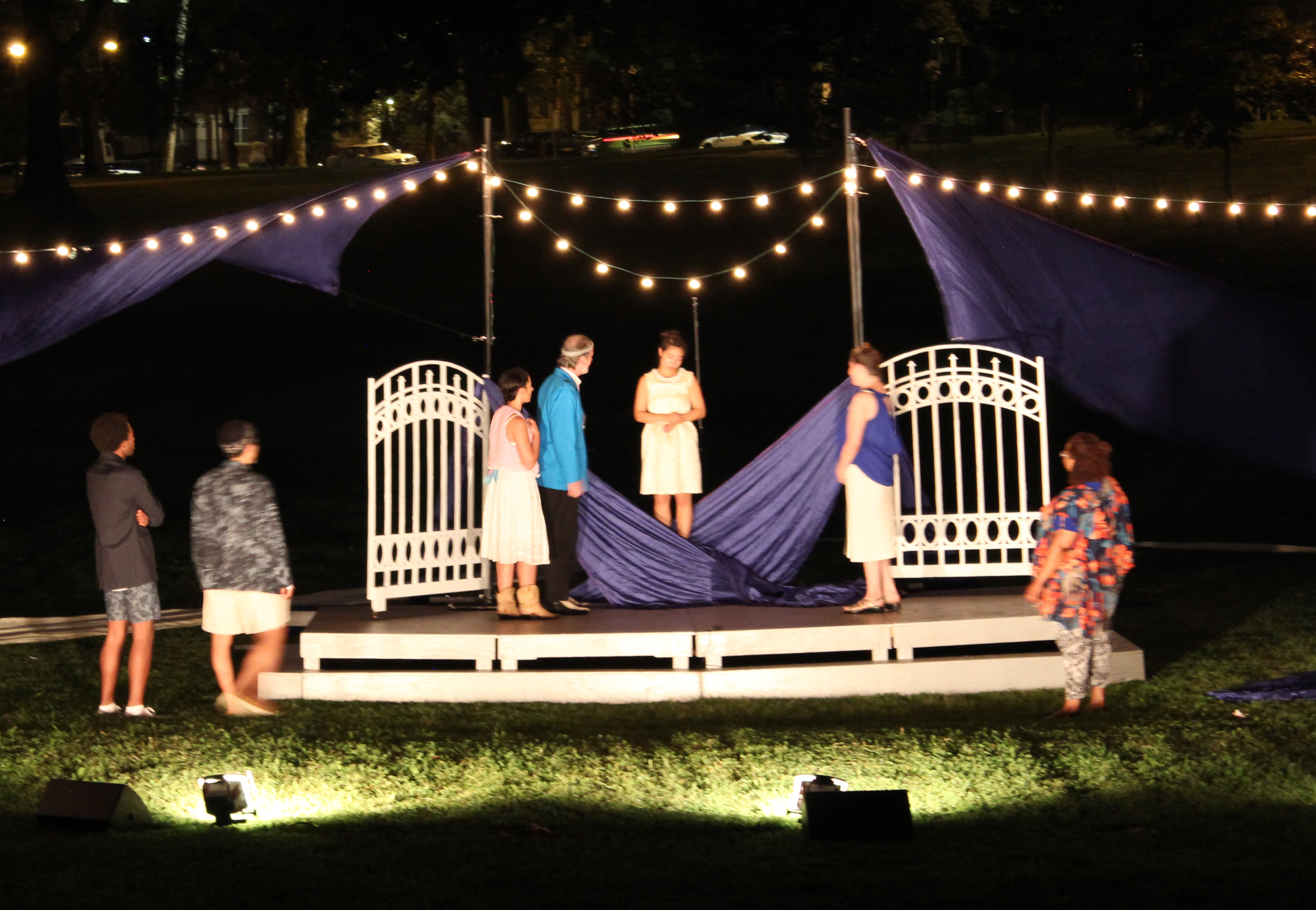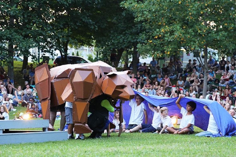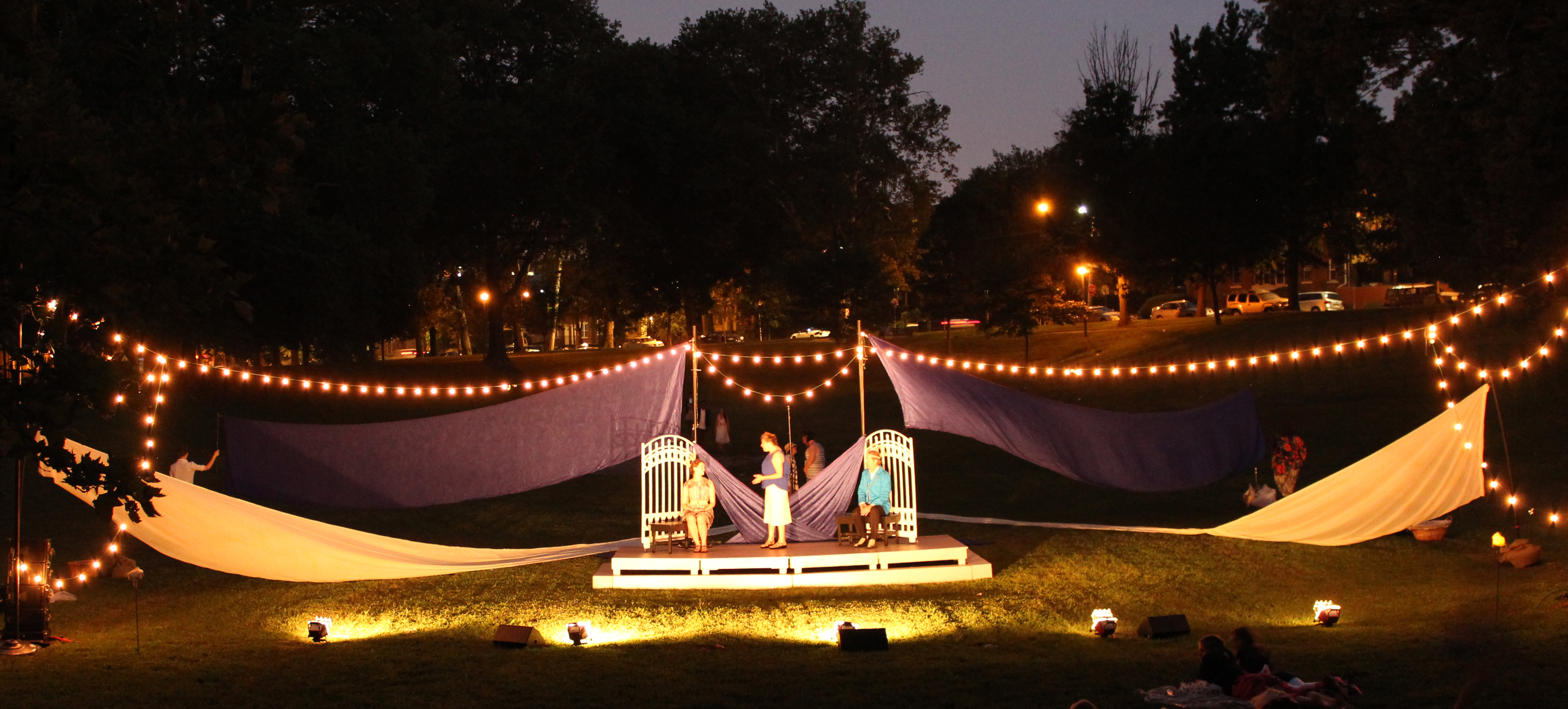 Shakespeare in Clark Park, an annual tradition, brings top-quality local actors to perform classic Shakespearean works and are incredibly well attended. Just one Saturday night performance can attract more than 1,000 people and their picnics. For SCP's tenth anniversary production of The Winter’s Tale, I worked closely with the director and puppet designer to create a whimsical, interactive environment for this outdoor production which integrated a chorus of 25 children and a large-scale bear puppet into the story. As with many outdoor environments, the key function of the scenery was to keep the audience focused on the action while also allowing the actors to connect with the audience. The result was a minimal flexible fabric environment that the actors moved as part of the action of the play.