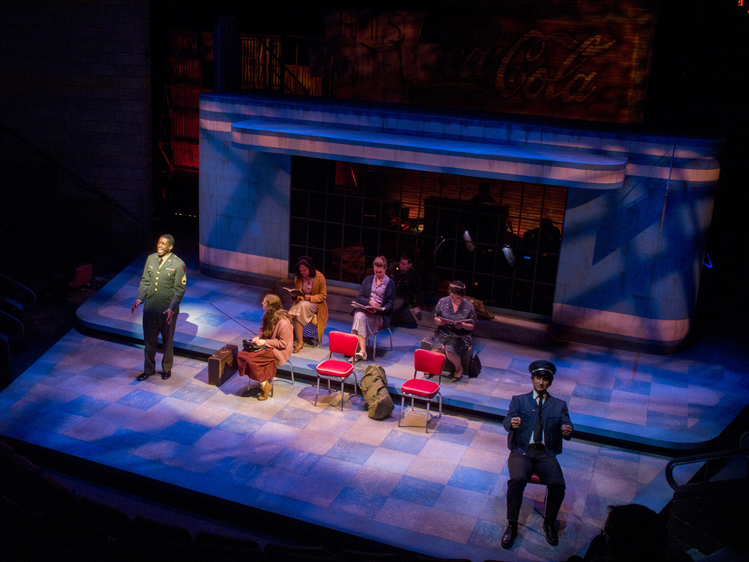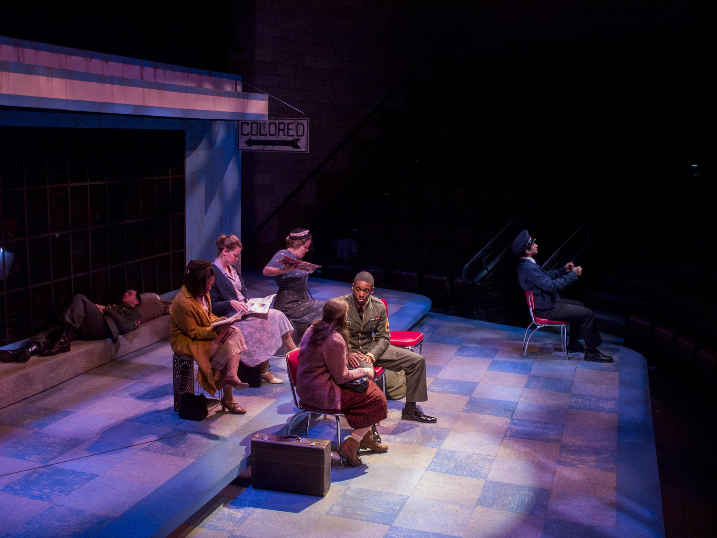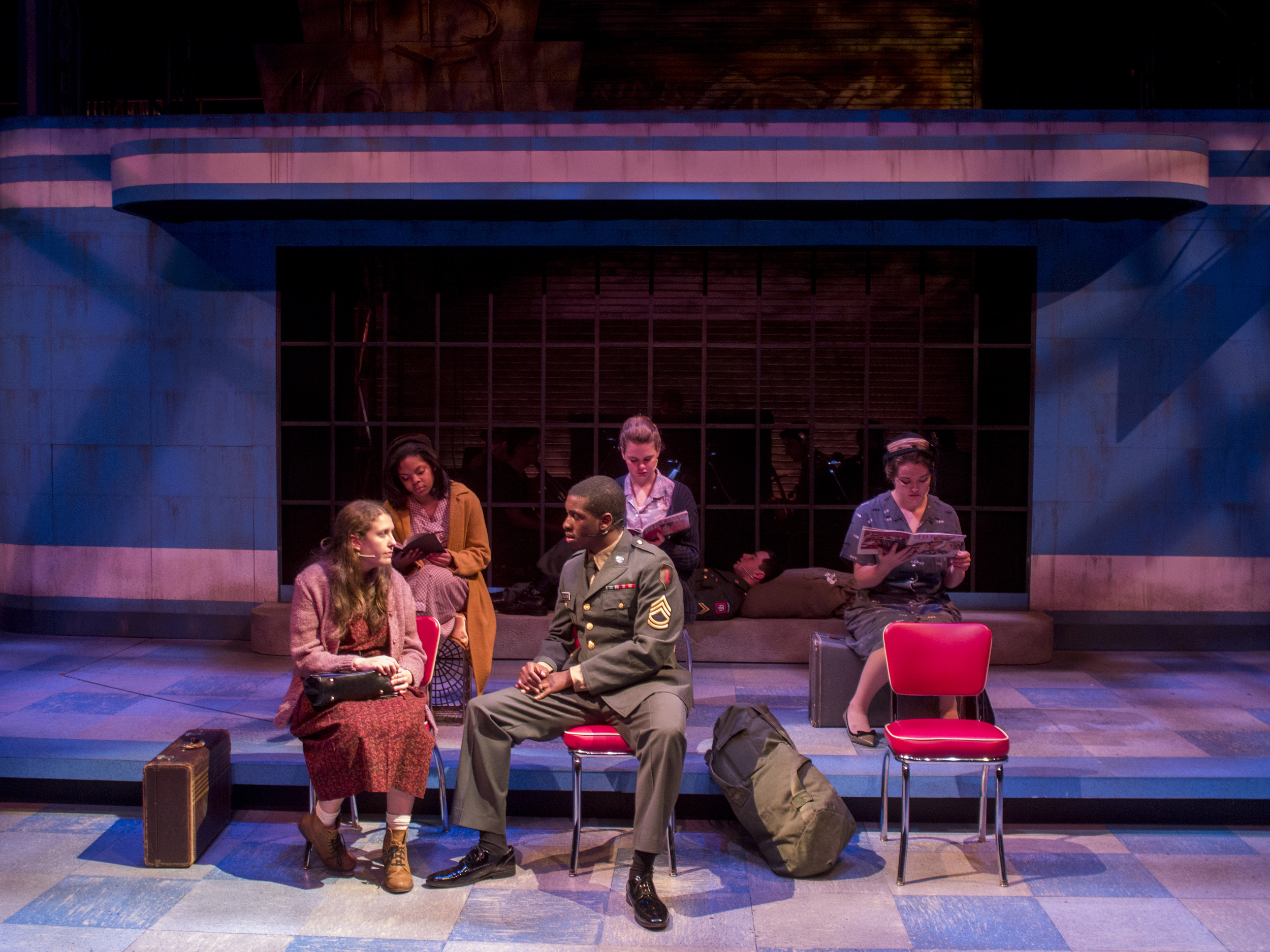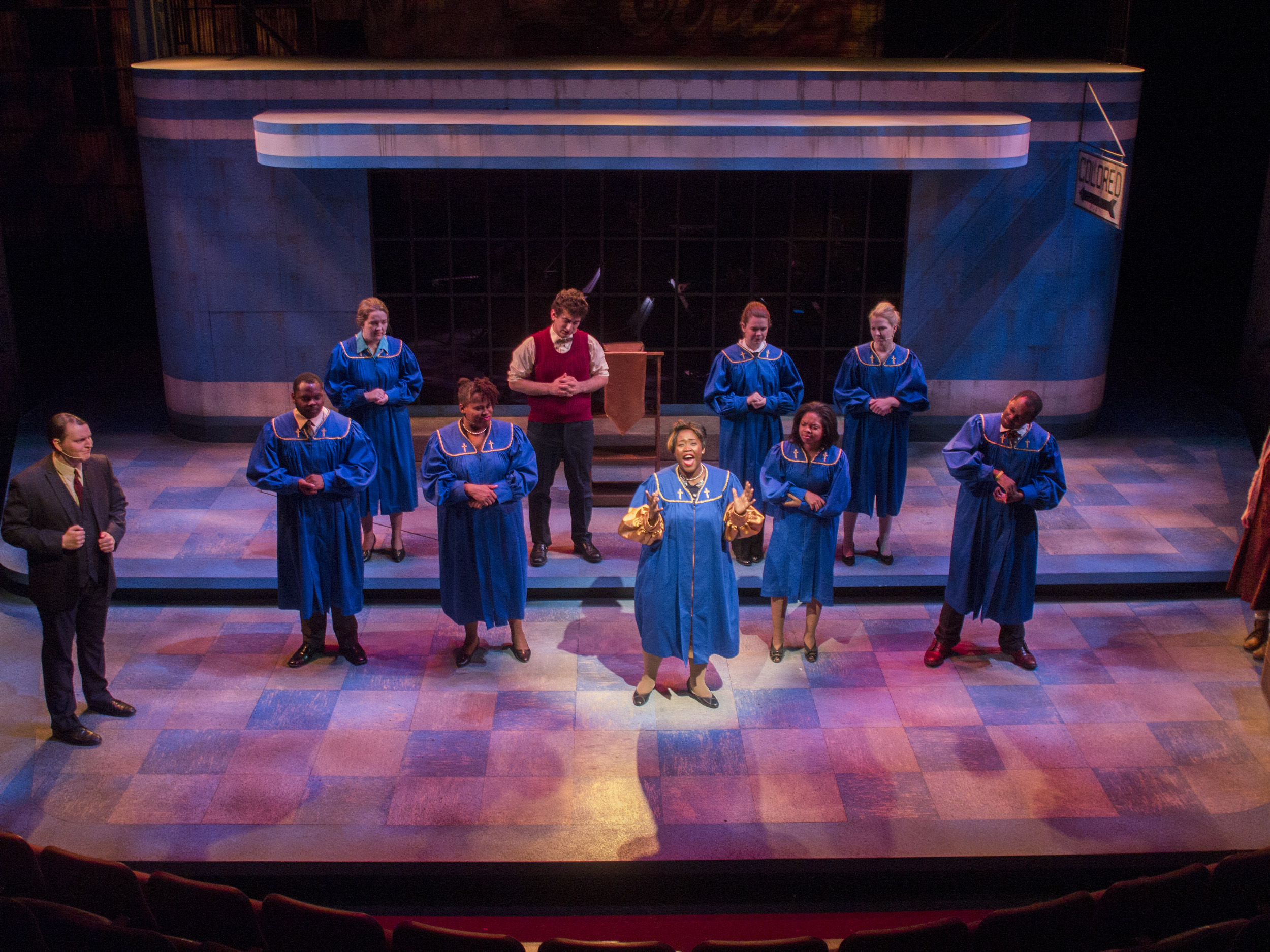 Violet, a musical journey across America during the 1960s, presented the same challenge of orchestra placement combined with multiple scene changes. The solution came in the form of a two-level set of a bus stop with the orchestra housed within the interior of the bus stop. The outside tiled area was used as the main playing space where chairs were rearranged through clever staging and strategic lighting to create different locations. The second level was used mainly for the more intimate flashback scenes, and highlighted the dimensional signage seen while traveling the American countryside. Students worked on a mechanized moving bed, a variety of faux painted surfaces, and transformed the rolling door of the back wall of the theatre into a giant Coca-Cola mural.