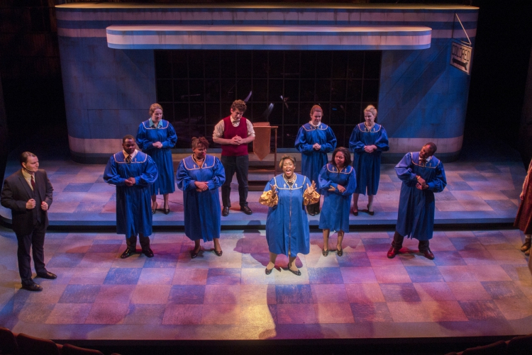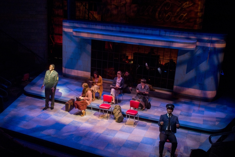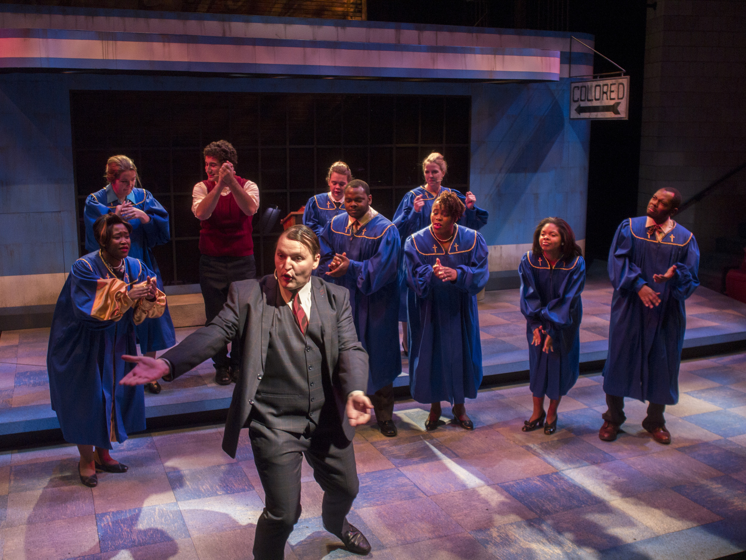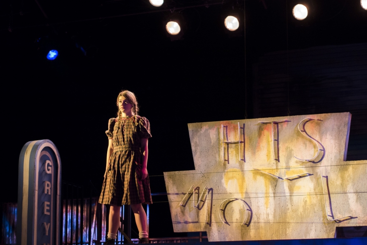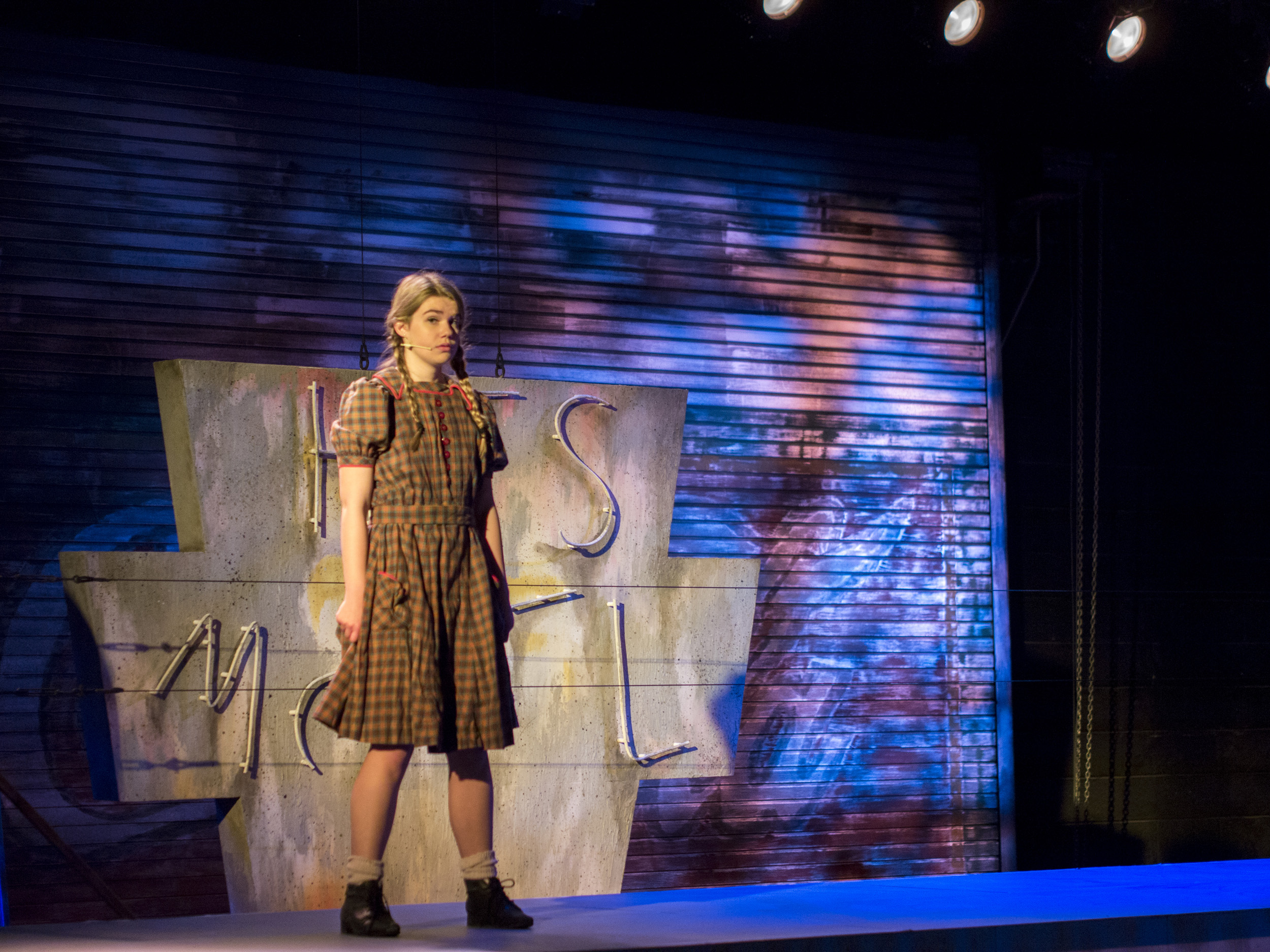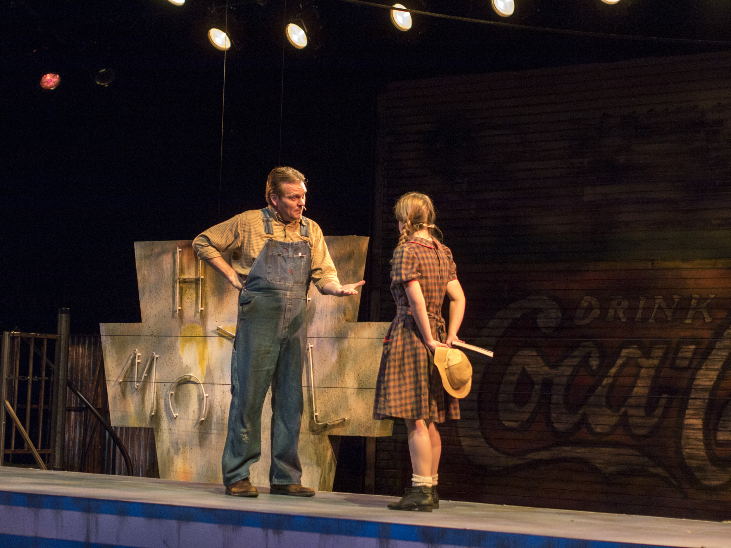 Violet, a musical journey across America during the 1960s, presented the same challenge of orchestra placement combined with multiple scene changes. The solution came in the form of a two-level set of a bus stop with the orchestra housed within the interior of the bus stop. The outside tiled area was used as the main playing space where chairs were rearranged through clever staging and strategic lighting to create different locations. The second level was used mainly for the more intimate flashback scenes, and highlighted the dimensional signage seen while traveling the American countryside. Students worked on a mechanized moving bed, a variety of faux painted surfaces, and transformed the rolling door of the back wall of the theatre into a giant Coca-Cola mural.