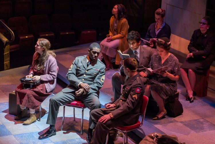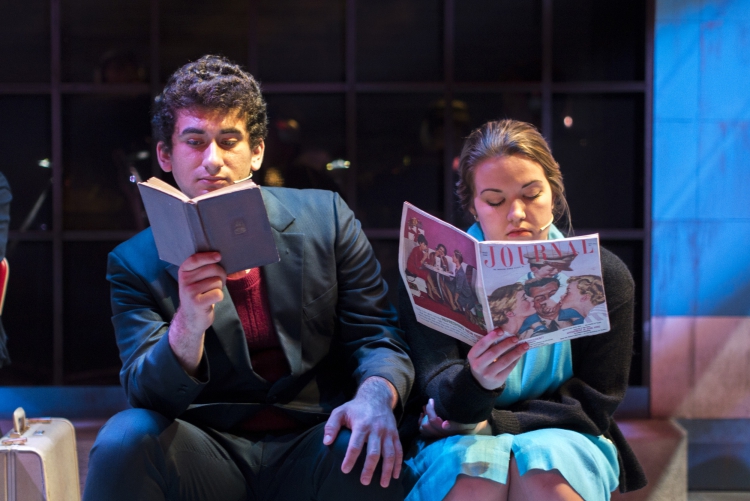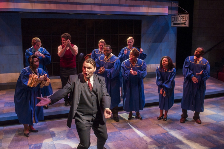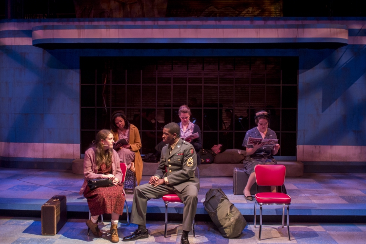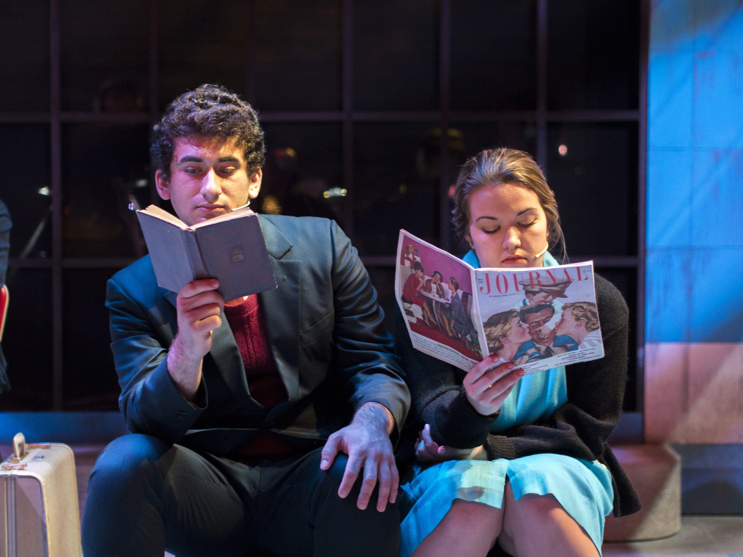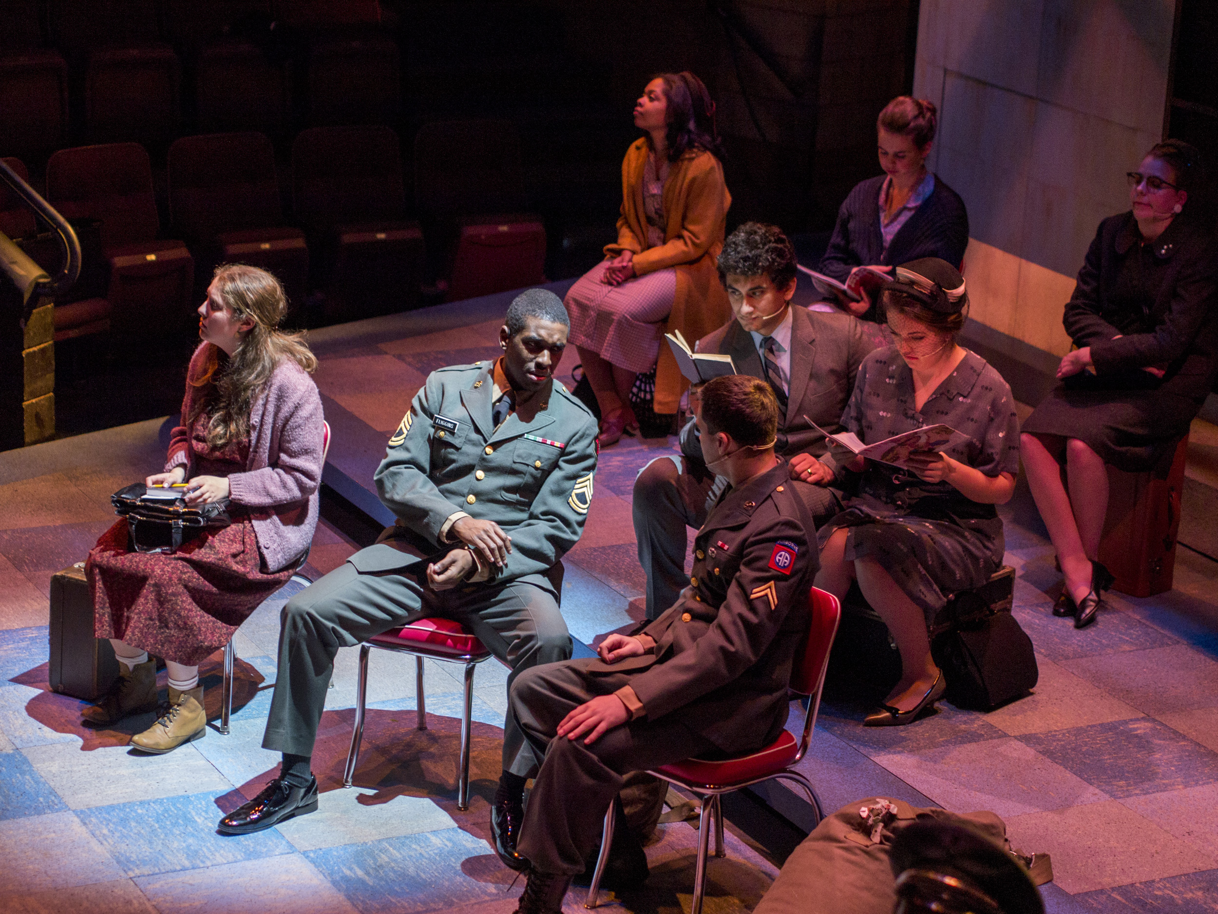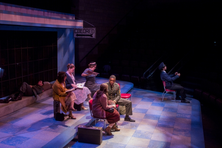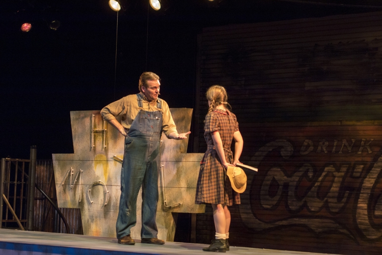 Violet, a musical journey across America during the 1960s, presented the same challenge of orchestra placement combined with multiple scene changes. The solution came in the form of a two-level set of a bus stop with the orchestra housed within the interior of the bus stop. The outside tiled area was used as the main playing space where chairs were rearranged through clever staging and strategic lighting to create different locations. The second level was used mainly for the more intimate flashback scenes, and highlighted the dimensional signage seen while traveling the American countryside. Students worked on a mechanized moving bed, a variety of faux painted surfaces, and transformed the rolling door of the back wall of the theatre into a giant Coca-Cola mural.